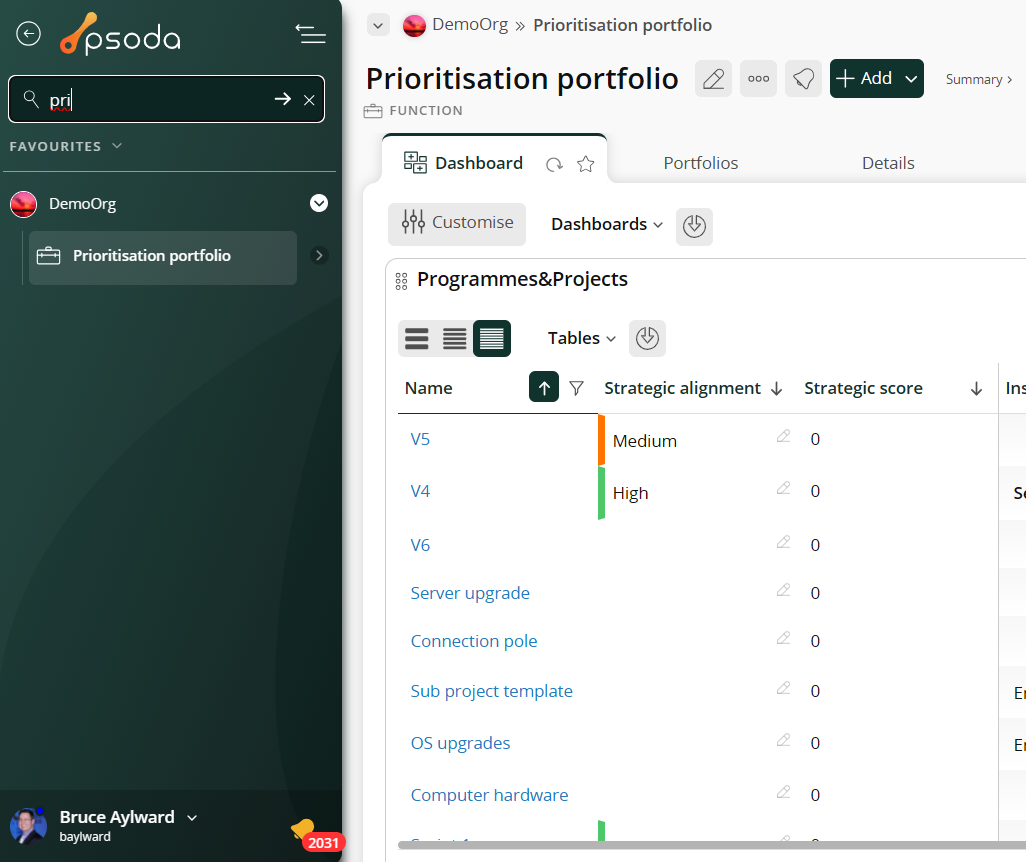 Instead of relying on the Programmes&Projects tab or dashlet, it’s quicker to find items using the navigator. Here, you can easily drill down to the specific item you need. Additionally, the navigator’s search function allows you to quickly filter and find items as you type.